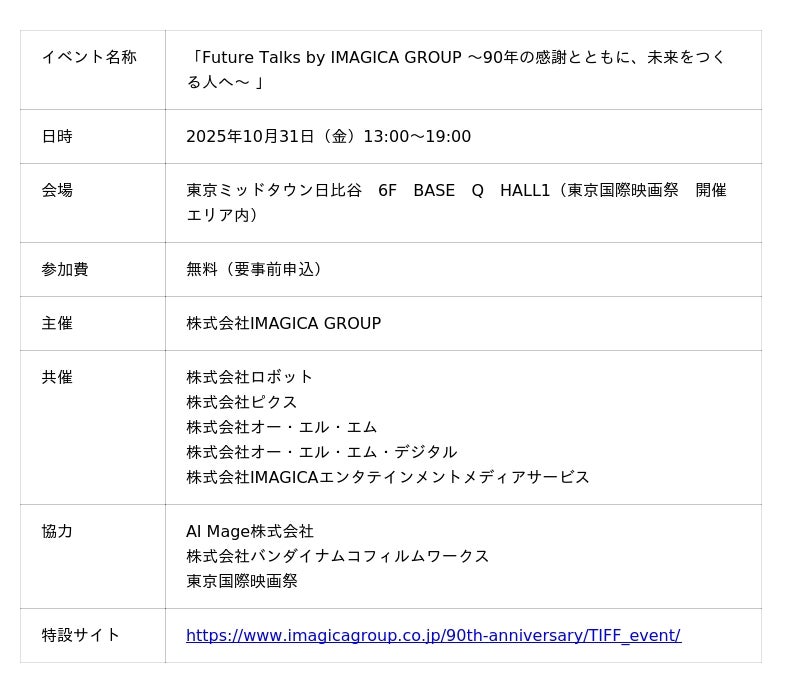 「Future Talks by IMAGICA GROUP ~90年の感謝とともに、未来をつくる人へ~」の4つのセッションを通じて、映像に携わる多くの方々とともに「未来をつくる」時間を共有できたことに、心より感謝申し上げます。IMAGICA GROUPは、創業90年の歴史を次の時代へつなげながら、これからも人と技術、表現をつなぎ、映像の可能性を広げてまいります。