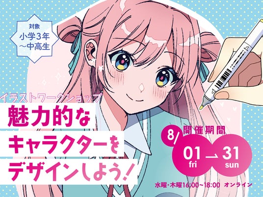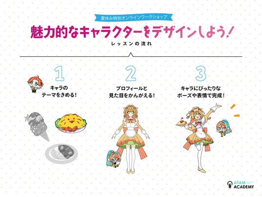 オンラインイラスト教室を運営する株式会社アタム(本社:東京都港区、代表取締役:宮澤惇、以下 アタムアカデミー)は、2025年8月1日(金)~31日(日)まで特別ワークショップ「魅力的なキャラクターをデザインしよう!」を開催します。このレッスンではキャラクターイラストの基礎から応用までを学ぶことができます。