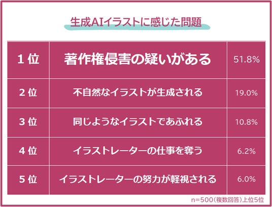 生成AIイラストに感じた問題のダントツは「著作権侵害の疑いがある(51.8%)」でした。