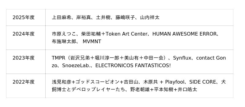 2022年の開所時より継続して展開する本プログラムでは、これまでに20組のアーティスト・フェローを輩出。「アート・インキュベーション」を通じて生み出された作品・プロジェクトの多くは、活動期間後もアップデートが施され、異なる場所や機会において発表が続けられています。
