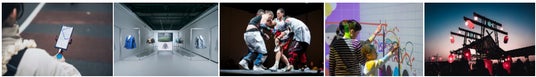 参考:2023年度 CCBTアーティスト・フェローの活動【左から】TMPR(岩沢兄弟+堀川淳一郎+美山有+中田一会)「AIが見てきた風景を辿る 人工知能紀行」/Synflux「WORTH: Digital Fashion Platform」/contact Gonzo「my binta, your binta // lol ~ roarsfrom the skinland ~」/SnoezeLab.「IISE (Immersive Inclusive Sensory Environment)」/ELECTRONICOS FANTASTICOS!「発電磁行列」