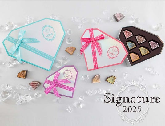 デルレイのアイコニックと言えば「ダイヤモンドショコラ」。煌めく未来を表現したダイヤモンドBOXの中に創業から75年間のアーカイブを紐解き、父ベルナール(イエローライン)と息子ヤン(ホワイトライン)のショコラを詰合せました。キャラメル、エキゾチックフルーツ、ピスタチオラズベリー、ライチ、ストロベリー、ヴェネズエラという濃厚で個性豊かな6種類のフレーバーをお楽しみください。