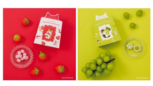 猫のキャラクターで大人気の「mofusand(モフサンド)」コラボパッケージが新登場!「グミチョコレート」は肉球の形をしたフルーツ風味チョコレートにフルーツグミをトッピング。「ラムネチョコレート」はフルーツ風味ラムネをフルーツチョコレートでコーティングしました。パッケージにはさまざまな猫が描かれているキュートなデザインになっています。