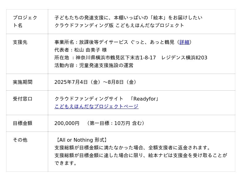 2025年7月4日より開始したクラウドファンディングにおいて、第一目標である10万円を無事達成いたしました。初のクラウドファンディングによる寄贈先は、神奈川県横浜市の「放課後等デイサービス ぐっと、あっと鶴見」。障がいや発達特性のある子どもたちが安心して過ごせる場に、絵本と絵本棚をお届けします。