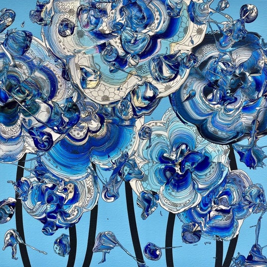 アクリル絵の具の混ざった偶発的な部分を、極細のペンでアウトライン化していくことで『偶然』を『必然』変えていくような独自の描き方をしている。