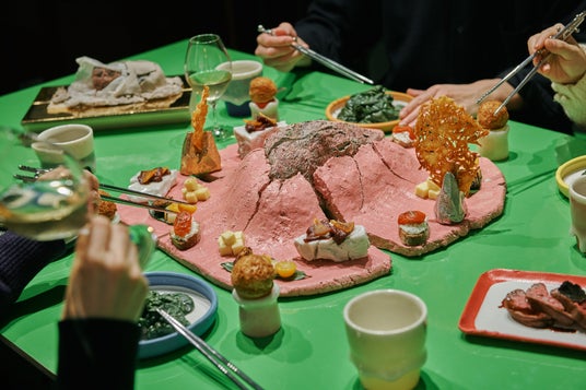 桑田卓郎+く「窯上げうどん」をGallery & Restaurant 舞台裏(麻布台ヒルズ)にて2025年1月25日(土)より開催中。アーティストの作品で食事ができるイベントも
