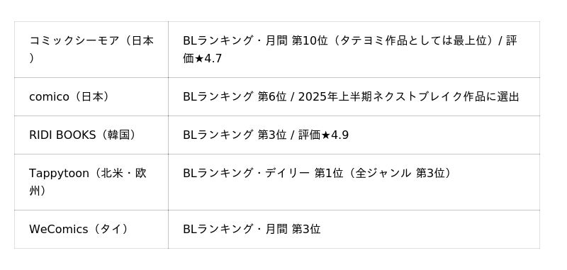 2025年9月14日(※)に最終話を迎える本作は、物語の終盤に向けて大きな盛り上がりを見せ、国内外の主要マンガ・WebtoonサービスにおいてBLランキング上位を記録しました。ここでは、その実績の一部をご紹介いたします。