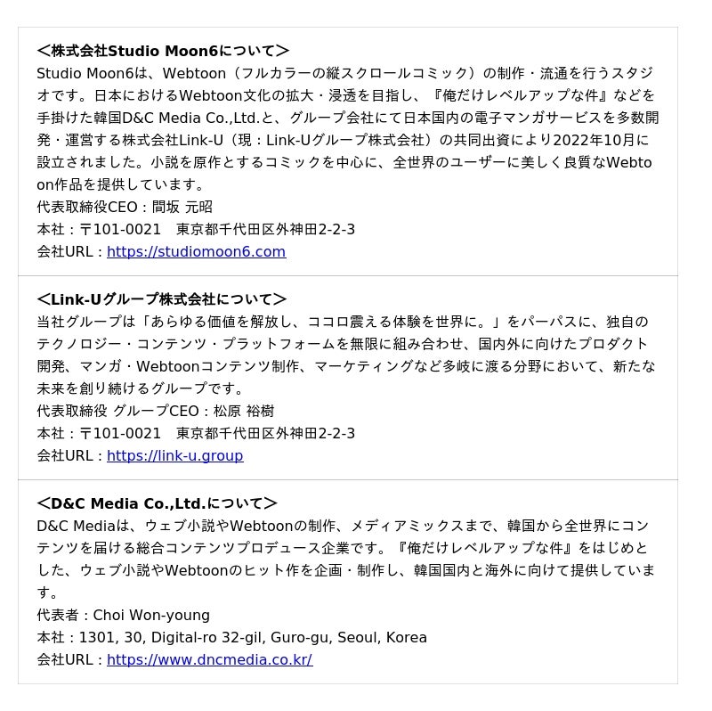 『蜜を塗られたS級ガイド』は、繊細な心情描写や奥行きある物語、タテヨミ・フルカラーならではの表現力、そして心を掴むキャラクターデザインによって、多くの読者の皆さまにご支持いただいてきました。Studio Moon6では、こうした作品づくりへのこだわりを大切にしながら、今後も愛される作品の創出と、多面的なIP展開に取り組んでまいります。