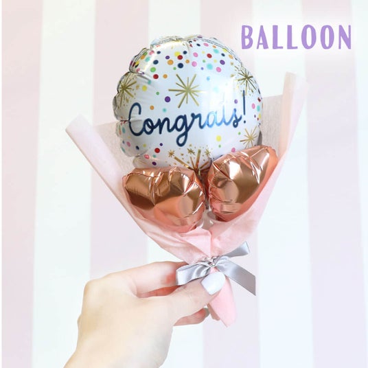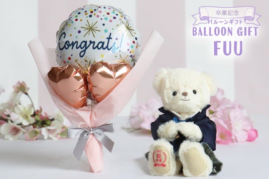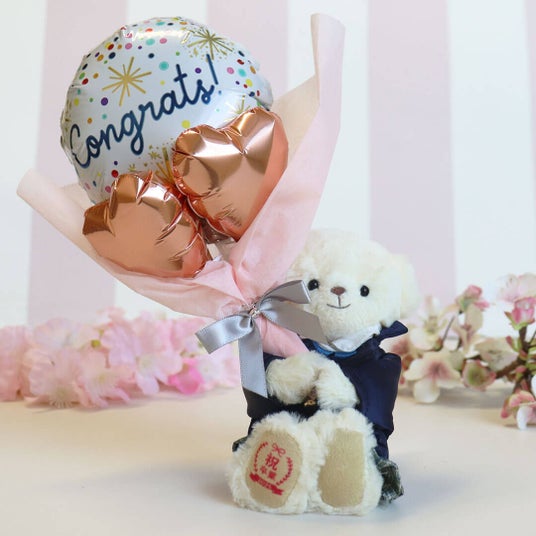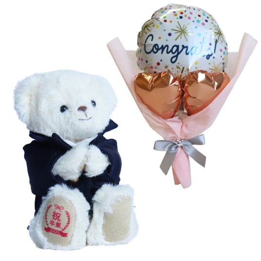 華やかなバルーン付き、卒業記念ベアギフトハレの舞台である卒業をテディベアと共に華やかなバルーンでお祝い。祝福と応援の気持ちを届ける心温まるギフトです。