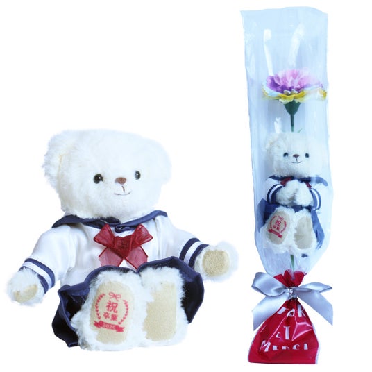 制服姿が愛らしい、1輪ブーケギフト学生時代のアイコン、制服をまとったテディベア。スモック、セーラー服、制服ブレザーの中からお選びいただけます。一輪のソープフラワーとセットになったブーケタイプで卒業ギフトにおすすめです。