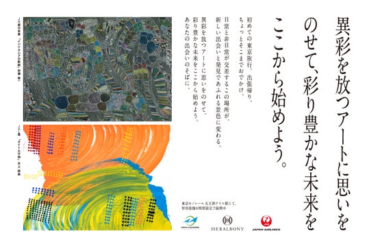 東京モノレール、JAL、ヘラルボニーは、多様性(DE&I)を尊重し、誰もがありのままに輝く社会の実現を目指してきました。今回の取り組みでは、JR東日本、JALが協賛として参画した、ヘラルボニーが主催する初の国際アートアワード HERALBONY Art Prize 2024の受賞作品を起用し、移動のひとときに新しい出会いと体験を生み出すことを目指しています。アート作品を通じて、移動するすべての人に特別なひとときを提供し、新しい価値観との出会いを生み出す機会を創出したいと考えています。