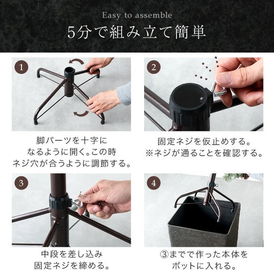 本製品は脚パーツを広げて固定ネジを締め、ツリーを差し込むことで簡単に組み立てが可能となっています。わずか5分ほどで設置できるので、届いたその日から飾りつけをお楽しみいただけます。