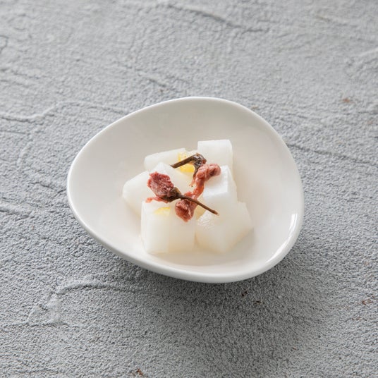 大根と桜のピクルスほんのり桜が香る、大根の洋風ピクルス。ローリエを効かせたピクルス液が、大根の食感と桜の風味に絶妙にマッチ。