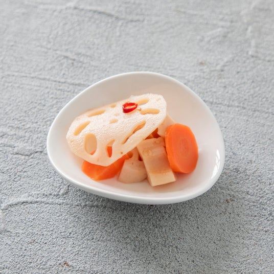 蓮根と人参のピクルスヘルシーで食物繊維豊富な蓮根と人参の野菜本来の味を追求しました。 食感の違いも楽しめる一品です。