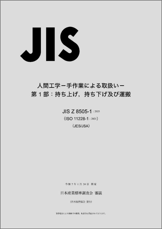 日本では、他国と比較して、重量物の取扱いに関する考え方が進んでおらず、その存在をほとんど知られていませんでしたが、このたび、「JIS Z 8505-1:2025 人間工学-手作業による取扱い-第1部:持ち上げ、持ち下げ及び運搬」を制定しました。本規格では、人間工学※¹的にタスクの強度・頻度及び作業時間を踏まえ、手作業による持ち上げ・持ち下げ及び運搬の推奨上限について規定しています。また、いくつかの作業要素の評価に関する要求及び推奨を提供するよう設計されており、労働者集団に対する健康リスクの評価を可能にします。