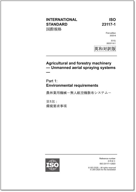 - ISO 23117-1:2023「農林業用機械-無人航空機散布システム-第1部:環境要求事項」