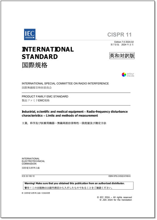 - CISPR 11 Ed. 7.0 CMV:2024「工業,科学及び医療用機器-無線周波妨害特性-限度値及び測定方法」
