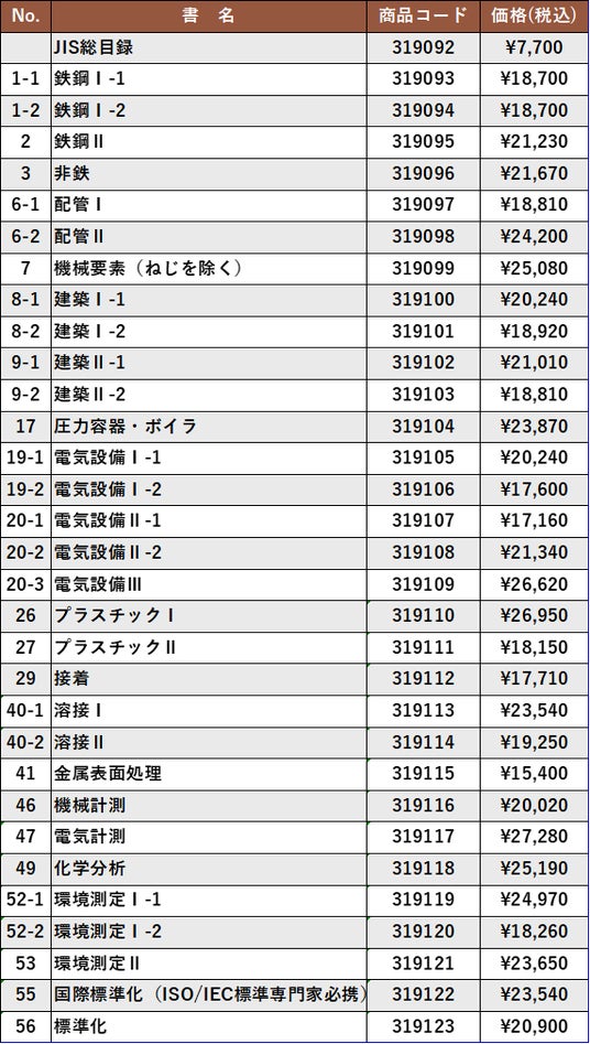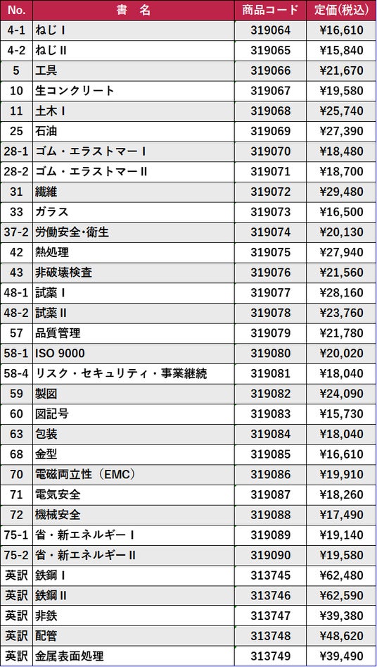 2025年1月に、以下の和文32種類(JIS総目録を含む)を発行予定です。