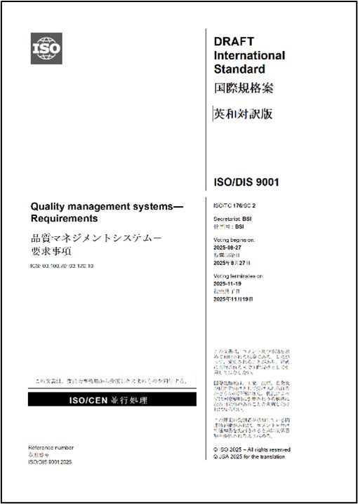 一般財団法人日本規格協会(本部:東京都港区、理事長:朝日弘)は、2025年9月16日(火)に『ISO/DIS 9001:2025品質マネジメントシステム-要求事項 Quality management systems - Requirements』の邦訳(英・日対訳版)を発行いたしました。