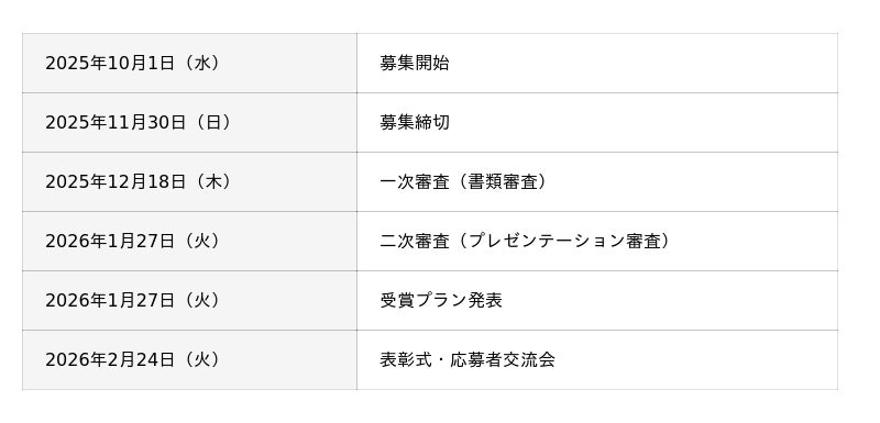- 一次審査を通過された方へのプレゼンテーション・サポート期間:2025年12月19日~1月27日