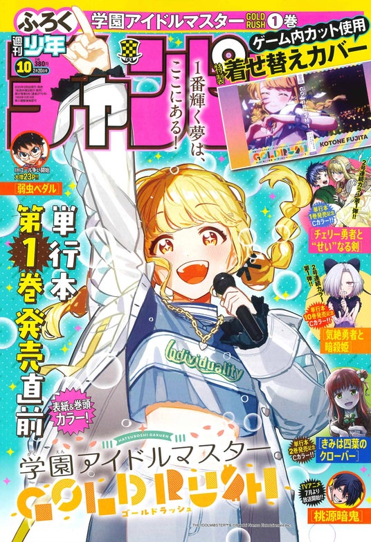 株式会社秋田書店(所在地:東京都文京区、代表取締役社長:山口徳二)は、発行している週刊少年漫画誌『週刊少年チャンピオン』(編集長:松山英生)2月6日(木)発売の10号にて、「学園アイドルマスター GOLD RUSH」の単行本発売を記念した表紙&巻頭カラーの特大号を刊行することをお知らせします。本編では藤田ことねの商店街リベンジライブがクライマックス! さらにここでしか手に入らないゲーム内カットを使用した「学園アイドルマスター GOLD RUSH」1巻着せ替えカバーふろくもございます。