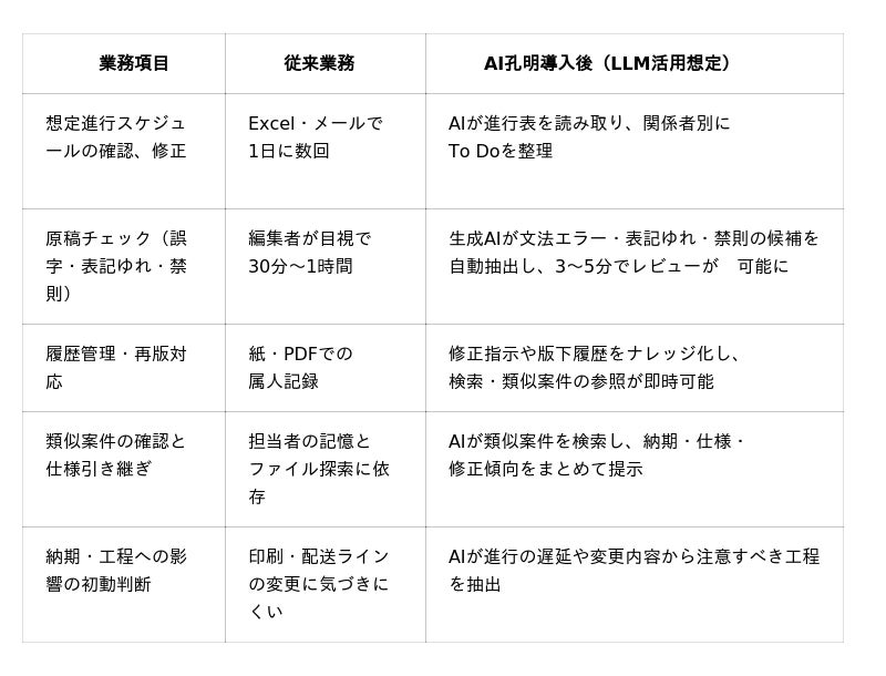 ・制作進行表の記録が部門ごとに分断され、進行状況の全体把握が難しい・原稿の表記ゆれや言い回しの統一が属人的で、修正が繰り返されている