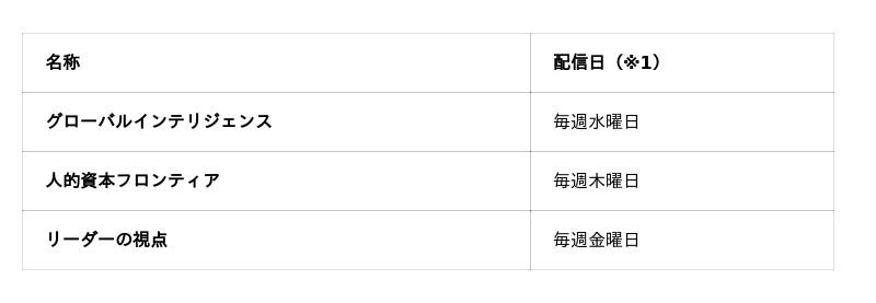読者ニーズの高い3つのテーマ(下表)から自由に選んで購読が可能です。従来のメールマガジンは新着記事へのリンクが中心でしたが、ニューズレターでは専門性と時事性に注力した情報を提供することで、読者の課題解決や知識向上にこれまで以上に貢献します。