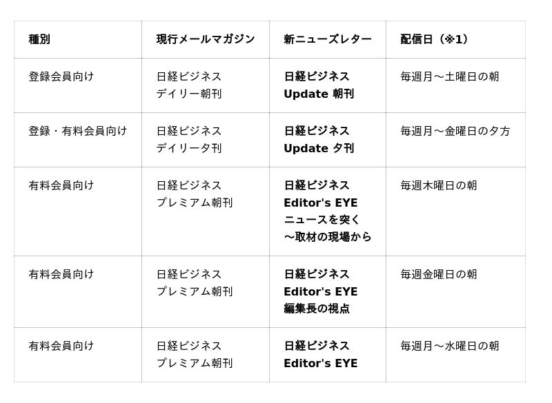 ニューズレターの配信に合わせて、既存のメールマガジンも10月1日より順次、冒頭に読みどころを追加するなどニューズレターとして生まれ変わります(下表)。特に有料会員向けに配信する「日経ビジネスEditor's EYE」では、取材を担当した記者や編集者による解説を木曜日と金曜日に掲載します。日経ビジネス編集部では、経営者を中心とする読者のために、ニューズレターを通じて“仕事に使える情報”を提供し、編集部と読者の信頼関係を強固なものに育てていきたいと考えています。