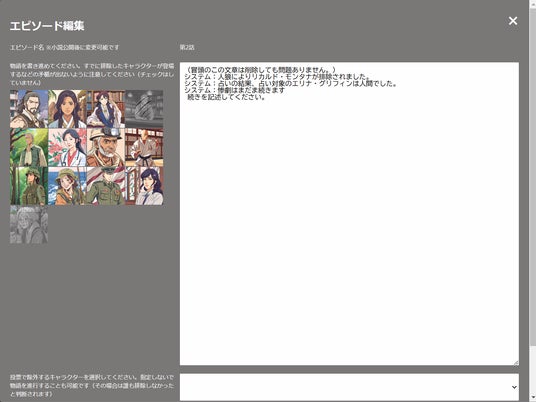 本機能では、利用者が13人のキャラクターの設定を用意します。そのキャラクターに対し、システムがランダムに人狼ゲームとしての役割を割り当てます(役割は人狼3名・人間6名・予言者・霊媒師・狩人・狂陣) 作者は割り当てられた役職を確認した上で彼らが登場するプロローグを執筆。