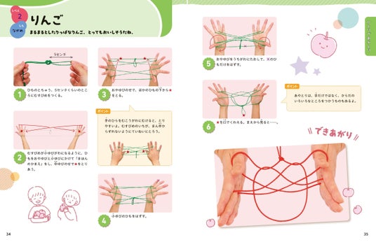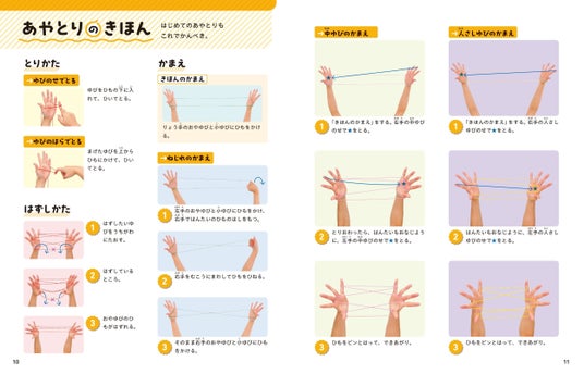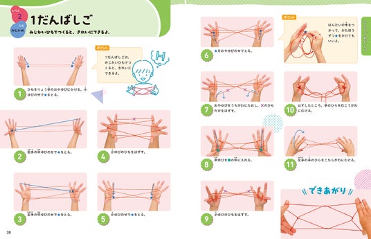 ひとりでできるあやとりや手品みたいなあやとり、技が続く連続あやとり、家族や友だちといっしょにあそべるあやとりなど、基本から応用あそびまで。