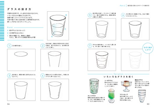 円筒形の応用で、グラスが描けたら、いろんなグラスを描いてみて