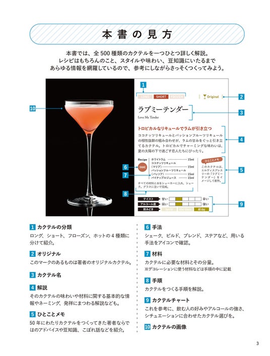 「自分でつくる宅飲み派」もいれば、「BARで雰囲気も楽しむ派」、「知識や蘊蓄を語りたい派」(インテリアとして飾りたい人)など「カクテル」の楽しみ方はいろいろ。どのニーズにも対応するよう、スタンダードから著者オリジナル、ノンアルコールカクテルまで500種類以上のカクテルを網羅し、美しい写真と詳しいレシピで紹介。そのカクテルの誕生やまつわるエピソードなど解説しています。