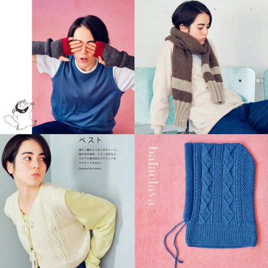 SNSで大人気のkiho.さんとnatsukiさんによる、帽子、マフラー、アームウォーマー、バラクラバ、ベストなど、かわいい作品を編みながら編み図の基礎を身につけましょう!