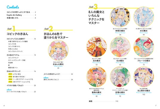 好きなキャラを塗りながら、魔法属性ごとに、目や髪といった人体パーツ、炎や星の輝きなどのエフェクト、クリスタルやファー、金属のような素材の質感までコピックをマスターするなら知っておきたいあらゆる表現を身につけられます。