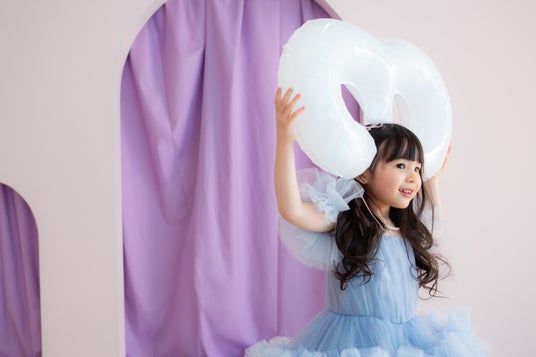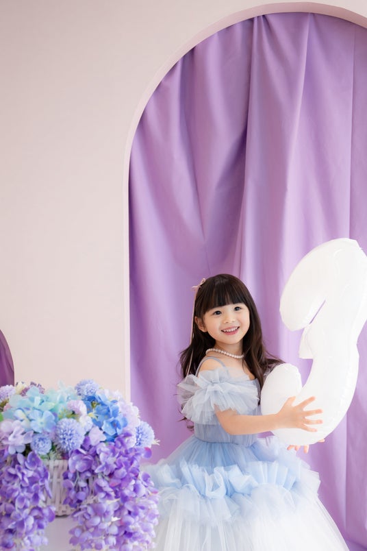 3歳記念は初めての七五三。子供らしさを引き出す『3』のバルーンで遊びながら撮影!お姉さんらしさも、まだまだあどけない表情も写真に残すことができます。