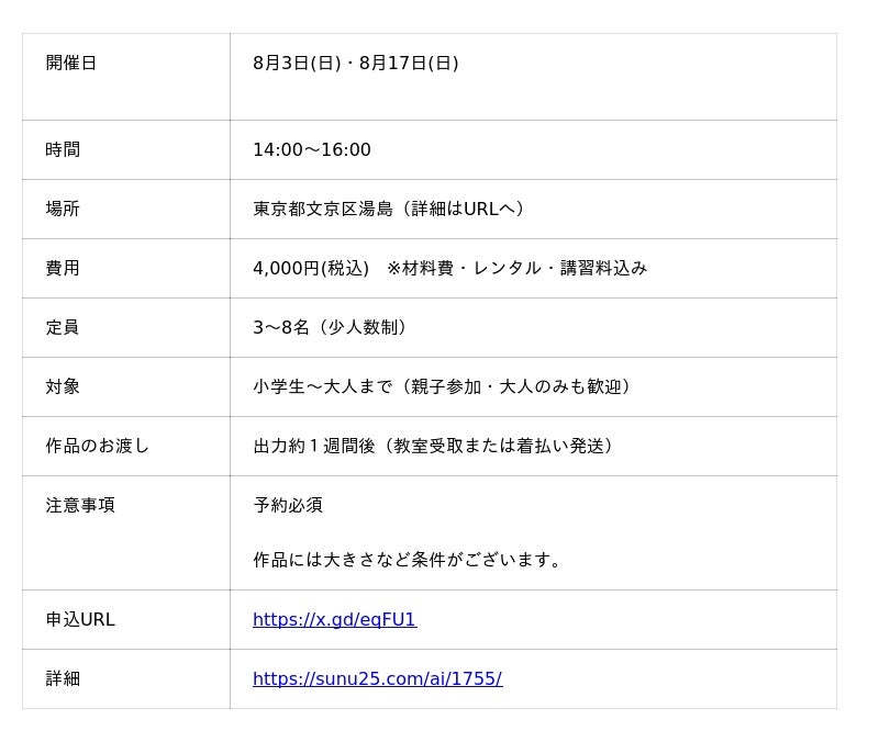 保護者も一緒に参加できるので、親子で協力しながら作品づくりに挑戦。学びながら楽しめる“体験型アクティビティ”として、夏休みの思い出にもなります。