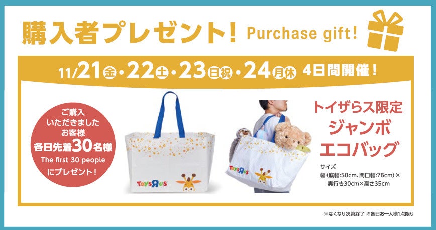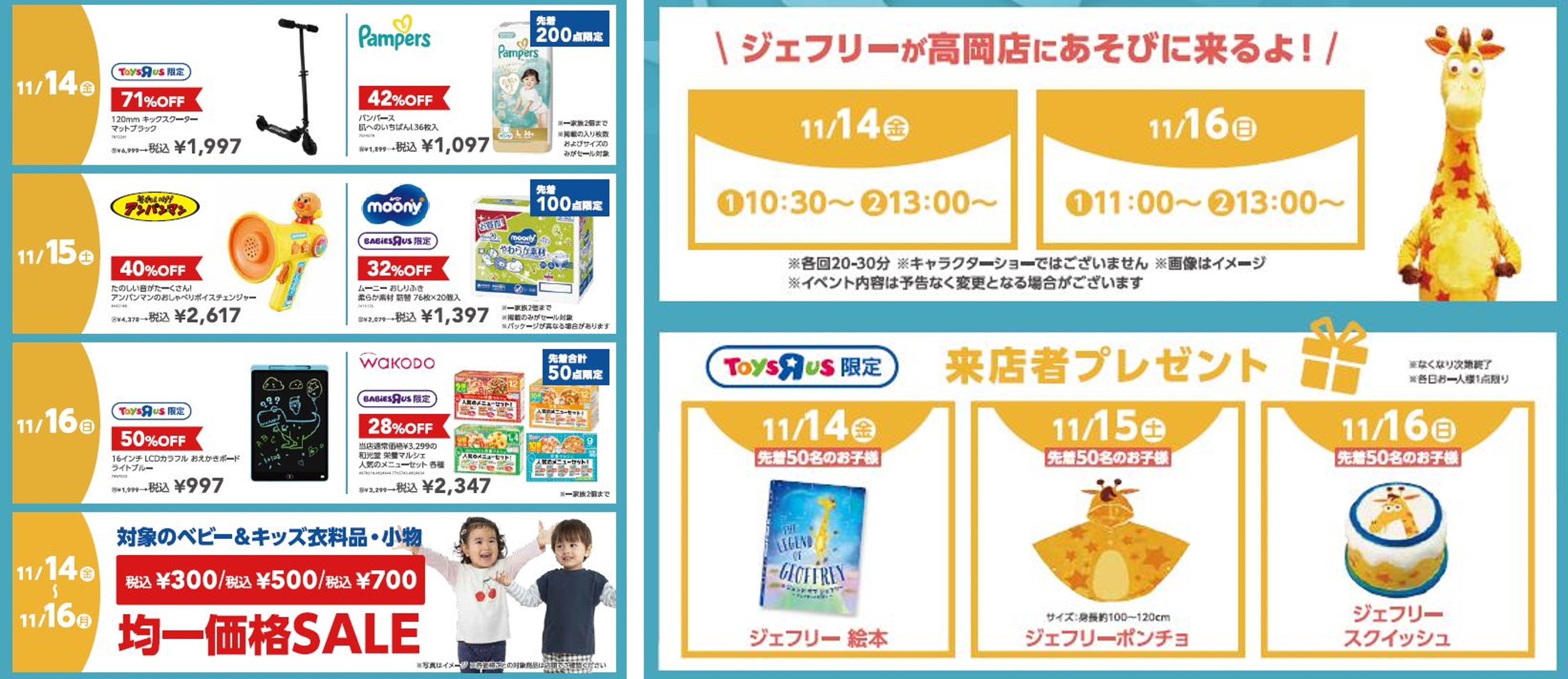 このたびのオープンを記念して3店舗では、トイザらスオリジナルのノベルティグッズのプレゼントや公式キャラクター「キリンのジェフリー」のグリーティング、おもちゃやベビー用品のスペシャルセールなど、子どもたちおよびご家族のみなさまにお楽しみいただけるプレゼントやイベントをご用意いたします。(※2)詳細については下記の当社ウェブサイトをご覧ください。