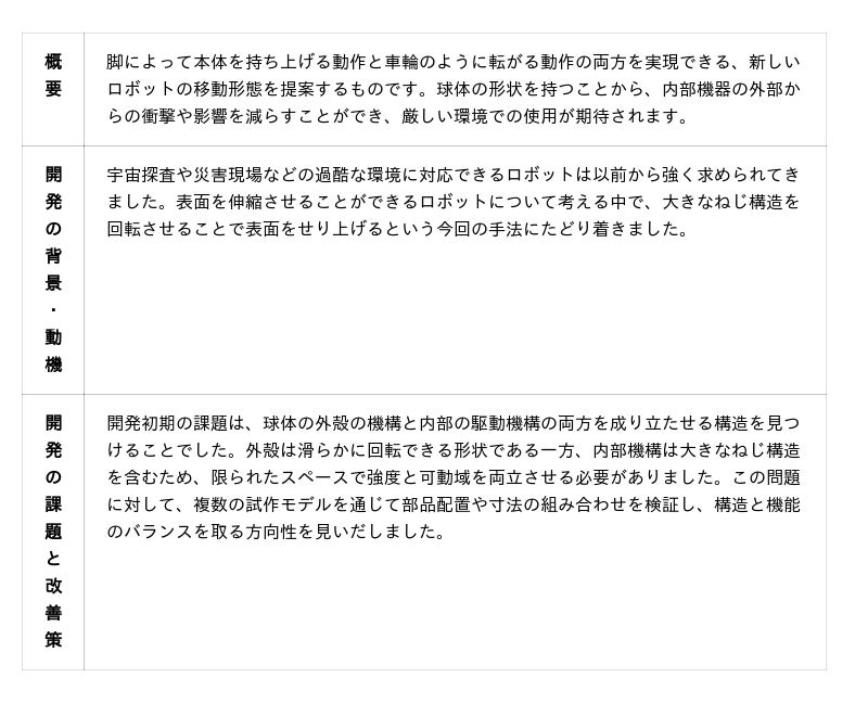 「球体状のボディ表面を物理的に押し出すことで自由な方向に転がるという、ありそうでなかったロボットの仕組み。試作と評価を繰り返してアップデートされているそのプロトタイプからは、ものづくりを心から楽しんでいる感覚が伝わってくる。思い描いたイメージを具現化するエンジニアリングの力も素晴らしいが、何より見る人をワクワクさせてくれる魅力が感じられる。」