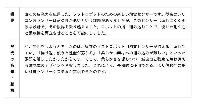 「ソフトロボットハンドの柔軟性とマテリアルの耐久性の研究がなされ、磁気による反発を生かした触覚感知による柔軟性と、摩耗軽減によって可能とされる耐久性に富んだロボットハンドの提案がなされている。実験結果のデータも説得力に富むもので、真摯な研究過程と解決方法へのアプローチに関しても審査時の評価が集まった。ソフトロボットハンドの新たな可能性を示すプロジェクトであるだけに、開発の今後に注目していきたい。」