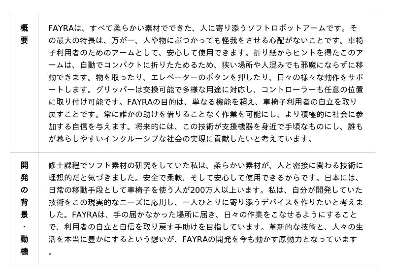 「腕の動作に困難のある車椅子利用者のための、折り畳め、低圧で動き、可動範囲も広く、実用性が高いソフトロボットアームです。実際の施設でのユーザーテストで、当事者のニーズやフィードバックを得ながら開発されている点も素晴らしいです。」