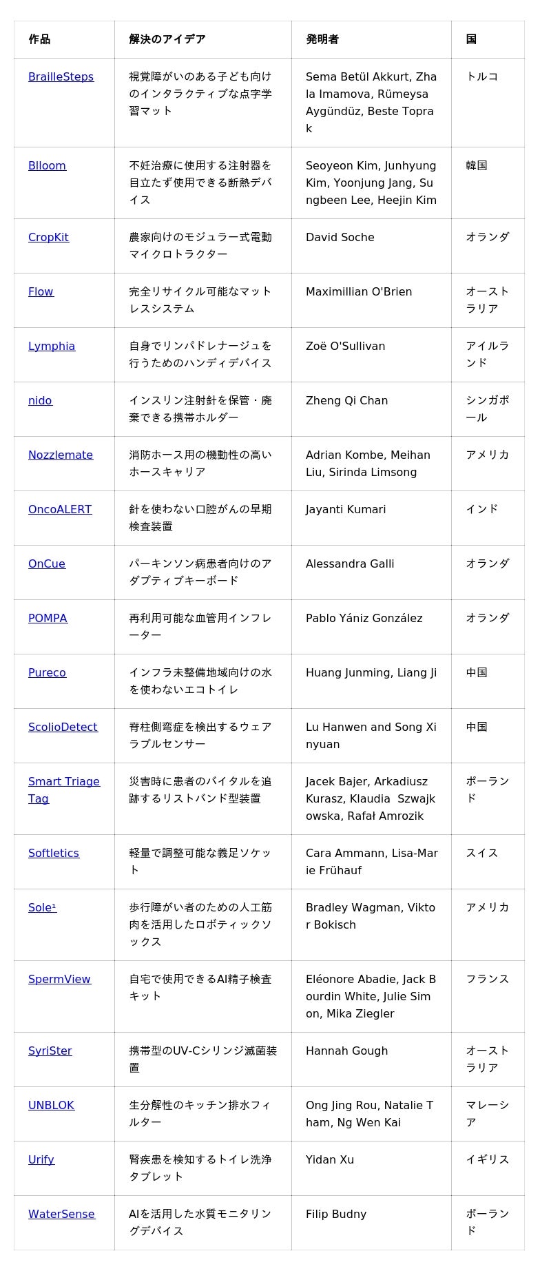 - 今年のトップ20作品には、腎疾患を検知するトイレ洗浄タブレット、AIを活用した水質モニタリングデバイス、歩行を支援する人工筋肉ロボティックソックスなどが含まれています。