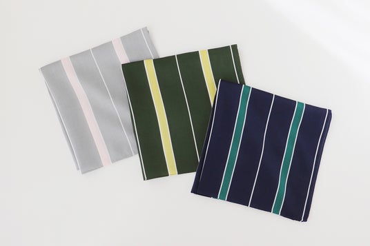 千鳥格子、レジメンタルストライプ、ドット、無地の四種類の柄で構成された折り紙の様なハンカチーフ。たたみ方で出てくる表情が変わるので、洋装、和装どちらでも楽しめる一枚です。ネイビーとワインが新色として加わります。
