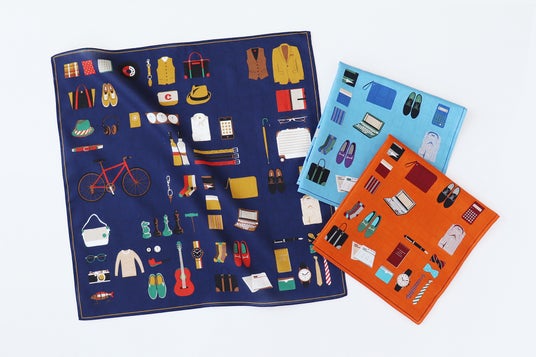 2014年の発売以来ロングセラー商品の「メンズコレクション」のハンカチーフに新色、ブルー、オレンジ、ネイビーの3色が登場します。「メンズコレクション」は、パソコンや時計などビジネスシーンで活躍する日常の必需品から、自転車やギターなどの趣味まで、身の回りのアイテムを描いた一枚です。新色は「スタイリッシュな紳士」をテーマに、これまでのスタンダードな配色から、アクセントカラーをプラスし、メリハリを利かせた配色となっています。ファッションに遊び心を加えたい方にもおすすめの一枚です。