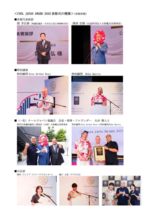 2025年9月3日、一般社団法人クールジャパン協議会(本部:京都市、代表理事 上田 輝彦、以下クールジャパン協議会)は、主催事業である「COOL JAPAN AWARD 2025」(後援:内閣府、外務省、経済産業省、観光庁、環境省、日本貿易振興機構(JETRO)、日本政府観光局(JNTO)、大阪府、大阪市、大阪観光局) の受賞対象46件の表彰式を大阪・関西万博会場で開催し、参加受賞者の全員が受賞スピーチを行うとともに歴代受賞者の方々が「COOL JAPAN AWARD」の受賞後の活用法についてスピーチを行いました。