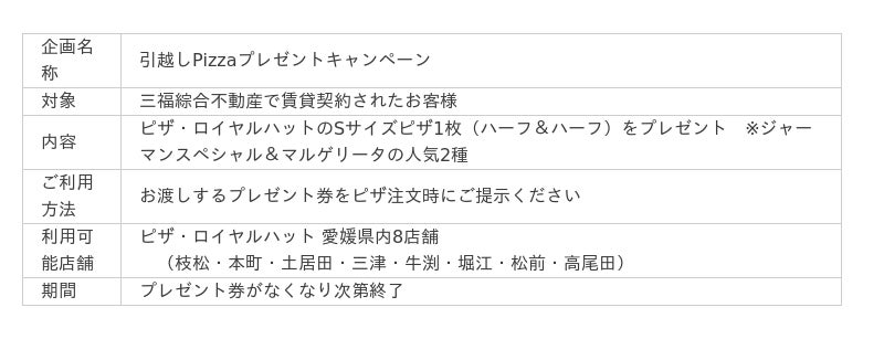 愛媛県松山市を中心にアパマンショップ加盟店を運営する株式会社三福綜合不動産(代表取締役社長:中矢孝則)は、賃貸物件をご契約いただいたお客様へ、地元人気ピザチェーン「ピザ・ロイヤルハット」Sサイズピザ1枚をプレゼントする「引越しPizzaキャンペーン」を開始いたしました。