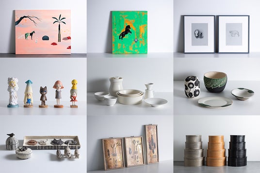 上段)田中健太郎さん(絵画)中段)左より北沢夕芸さん(オブジェ)/大谷哲也さん(うつわ、鍋)/大谷桃子さん(うつわ、植物鉢)下段)左より越智香住さん(オブジェ、箱)/はいいろオオカミ+花屋西別府商店(鏡を用いた作品)/IFUJI(ボックス)