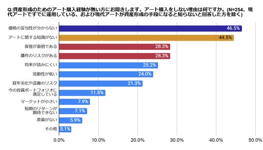 資産形成のための現代アートの購入経験がない人に理由を聞いたところ、半数近くが「価格の妥当性が分からない」「アートに関する知識がない」と回答。