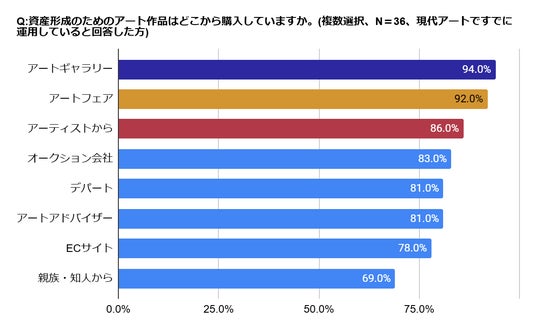 現代アート作品の購入先1位はアートギャラリー、僅差でアートフェアと回答。