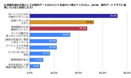 - 現代アートによる資産形成を運用している人の約7割がポートフォリオの分散ができている点にメリットを感じている。また、過半数は投資リターンの大きさもメリットに挙げている