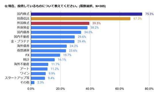 75%超が国内株式に投資しており、次いで投資信託、外国株式と回答。